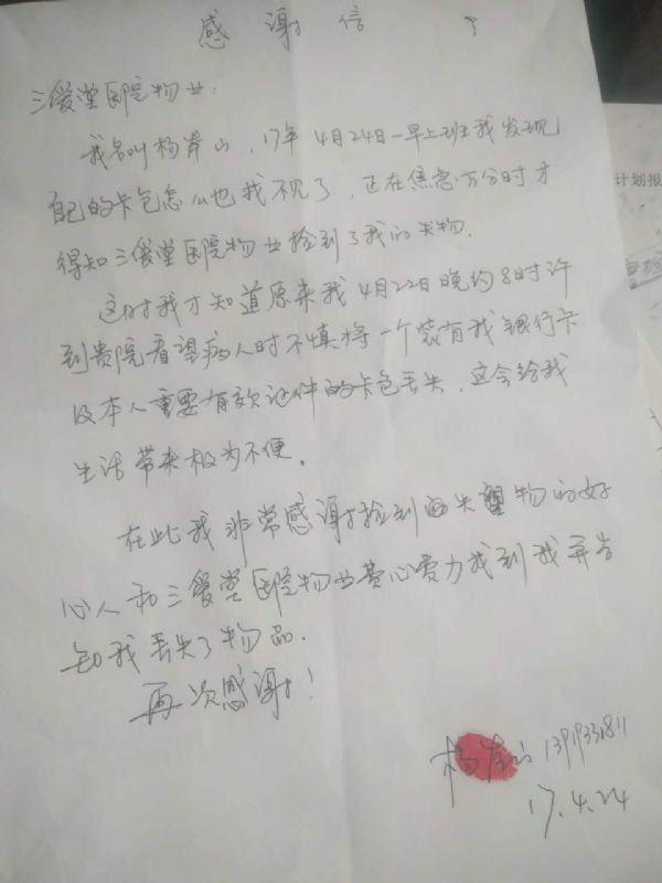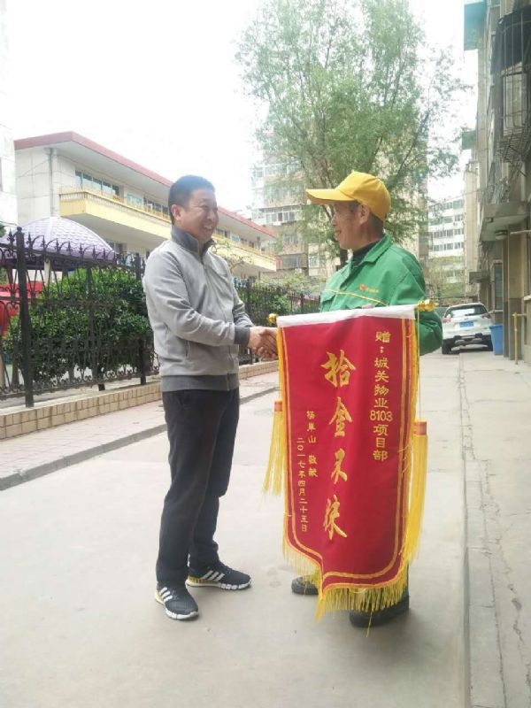 424一早,失主就來到了三愛堂醫(yī)院并將一副題為“拾金不昧”的錦旗送到了物業(yè)辦公室。失主激動地握住賈經(jīng)理的手說道:“感謝城關(guān)物業(yè)培養(yǎng)出了這樣一個品德高尚的員工,要不是這位員工,會給我的生活帶來多大的不便呀!”