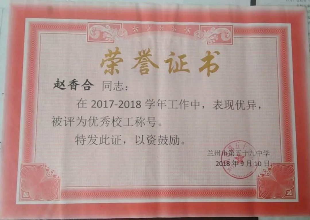 蘭州市第五十九中學(xué)召開教師節(jié)表彰大會,會上城關(guān)物業(yè)員工魏萍、柴春林、趙香合等被評為“優(yōu)秀校工”。
