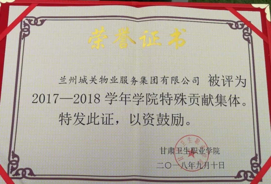 甘肅衛(wèi)生職業(yè)學(xué)院召開2018-2019學(xué)年開學(xué)典禮暨教師節(jié)表彰大會。城關(guān)物業(yè)服務(wù)集團被評為2017-2018年學(xué)院特殊貢獻集體獎。