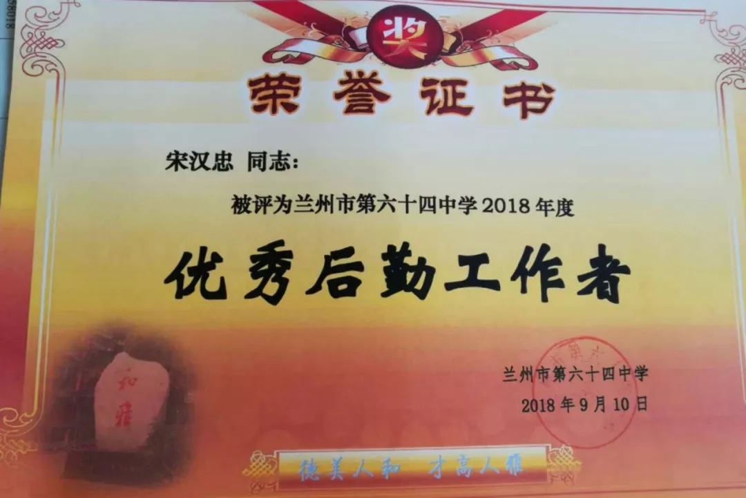 蘭州市第六十四中學(xué)召開教師節(jié)表彰大會,城關(guān)物業(yè)員工宋漢忠等被評為“優(yōu)秀后勤工作者”。