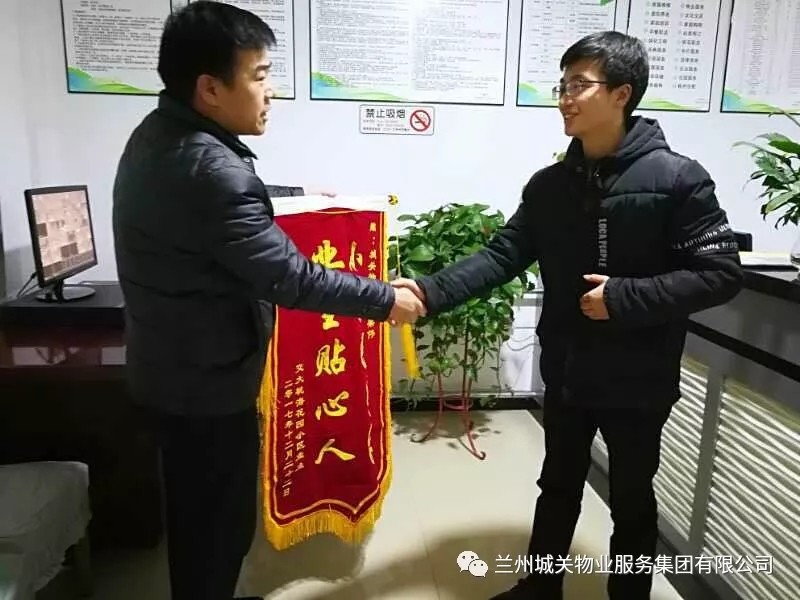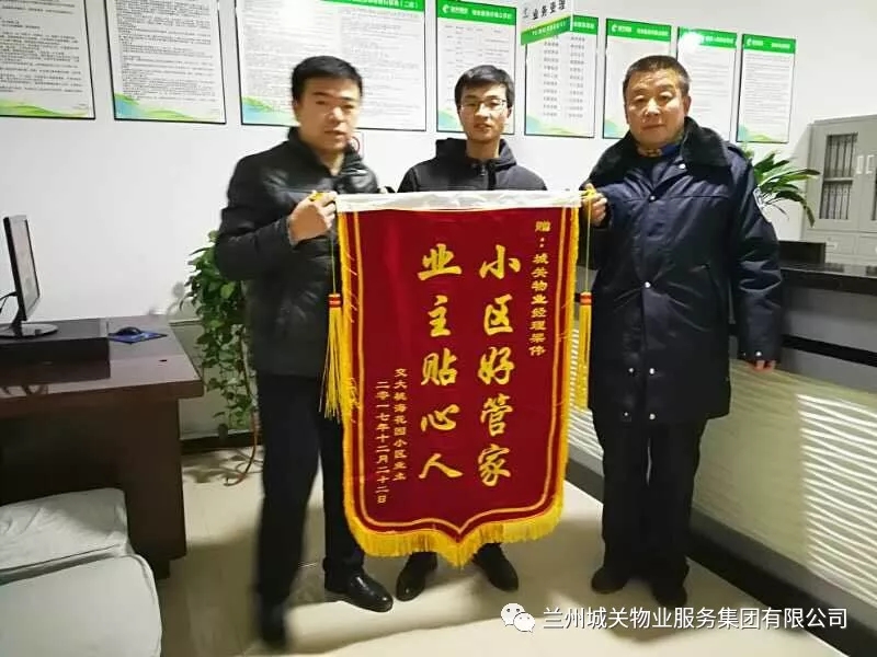 1月14日晚,交大桃海花園業(yè)委會劉主任代表全體業(yè)主,將一面題有“小區(qū)好管家,業(yè)主貼心人”的錦旗送至項目經(jīng)理梁偉手中,并對城關(guān)物業(yè)的服務(wù)工作給予了高度的評價和肯定。