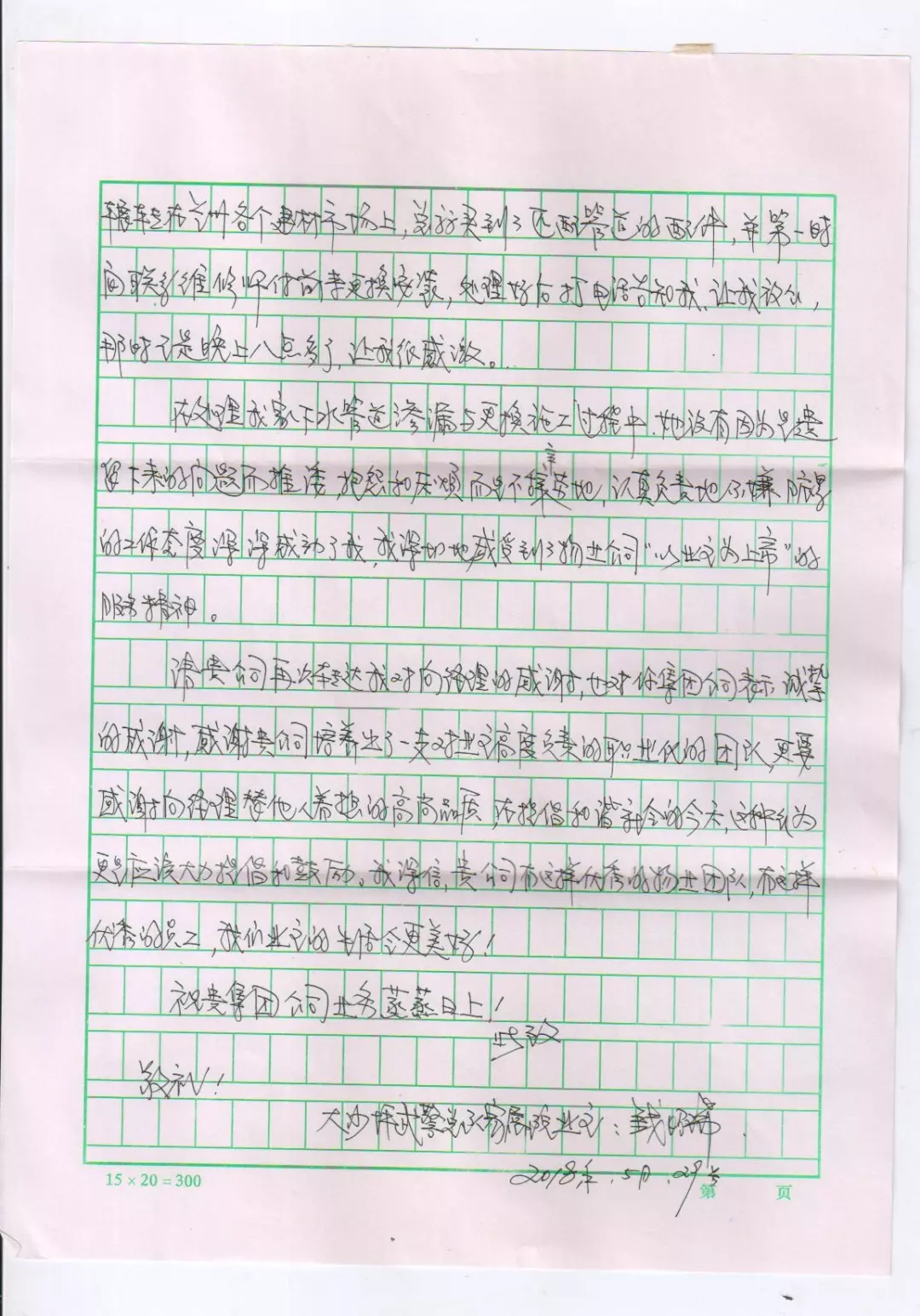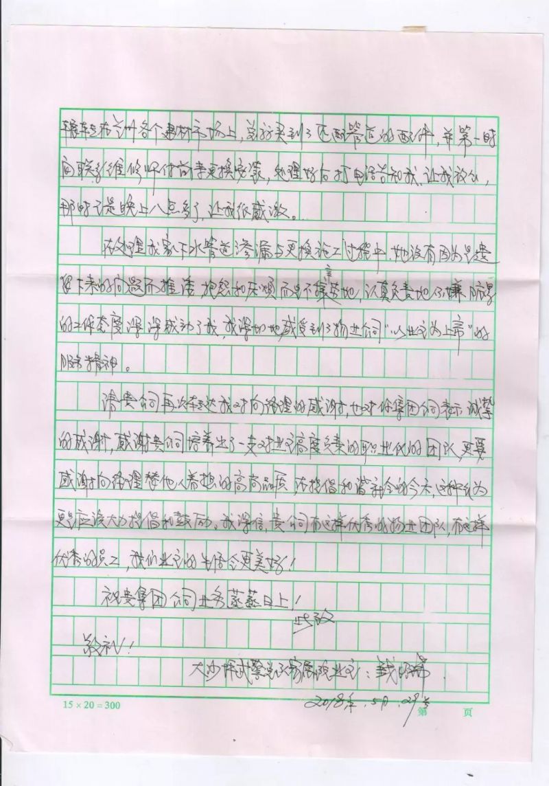 在為錢先生解決下水管道滲漏問題及安裝更換的過程中,向玉芳經(jīng)理沒有一絲推諉,沒有一句抱怨,不嫌臟亂、認真負責的工作態(tài)度得到了業(yè)主的肯定和贊譽。業(yè)主錢先生特意寫來感謝信,以此來表達對向玉芳經(jīng)理的感激之情,及對城關物業(yè)服務工作的肯定和贊揚。