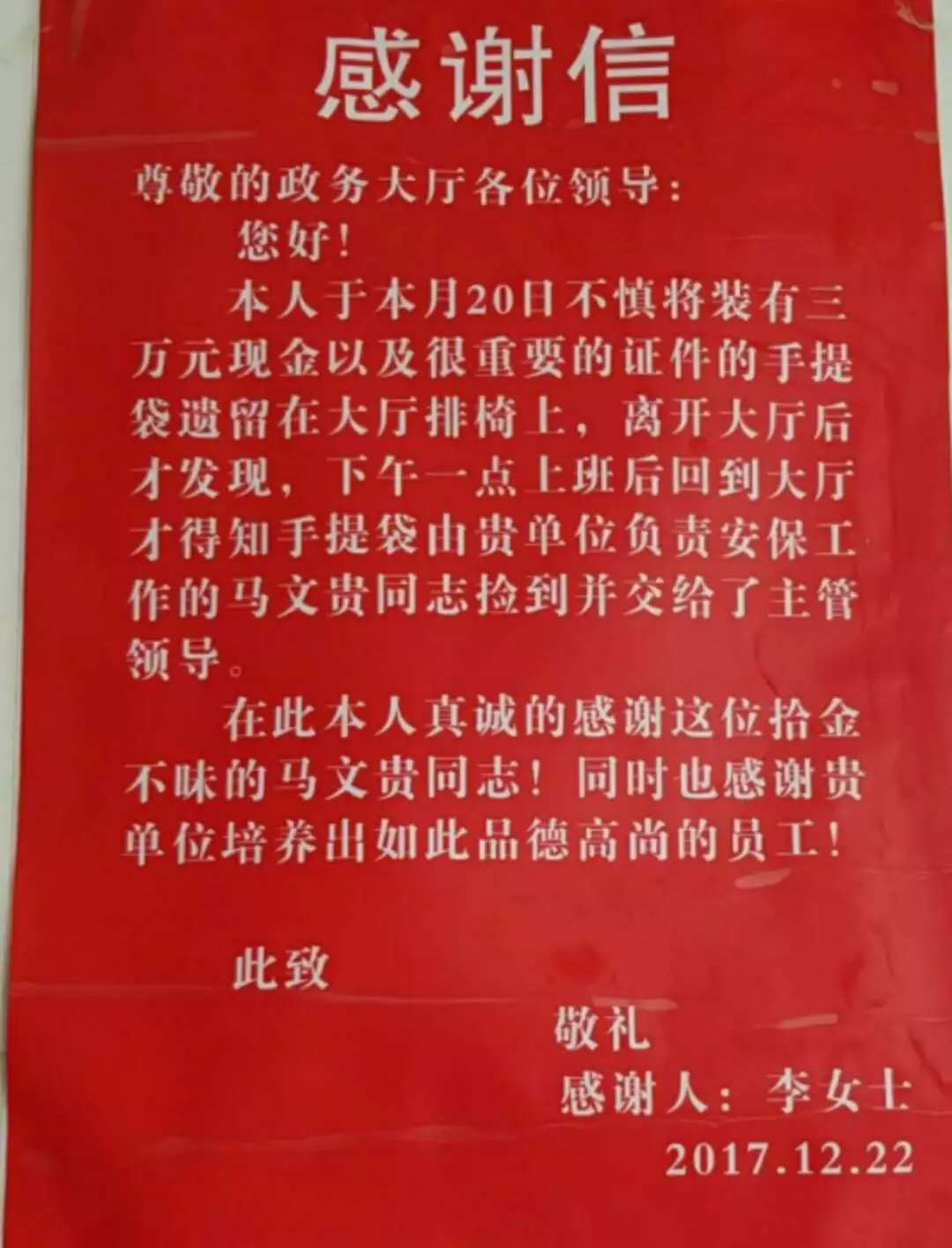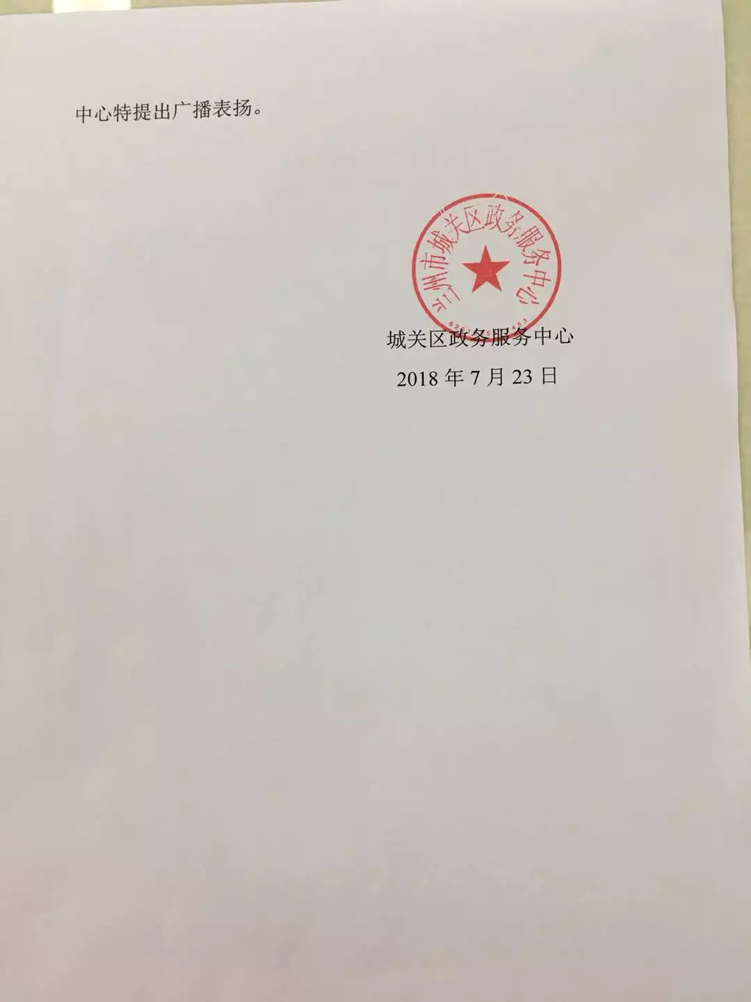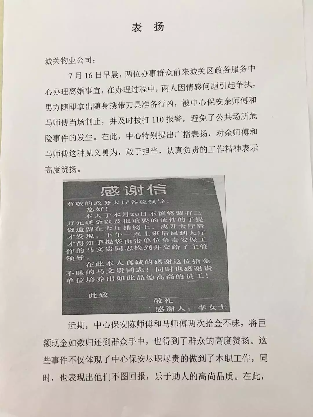 ▲城關(guān)區(qū)政務(wù)服務(wù)中心給城關(guān)物業(yè)馬文貴和余會明的感謝信